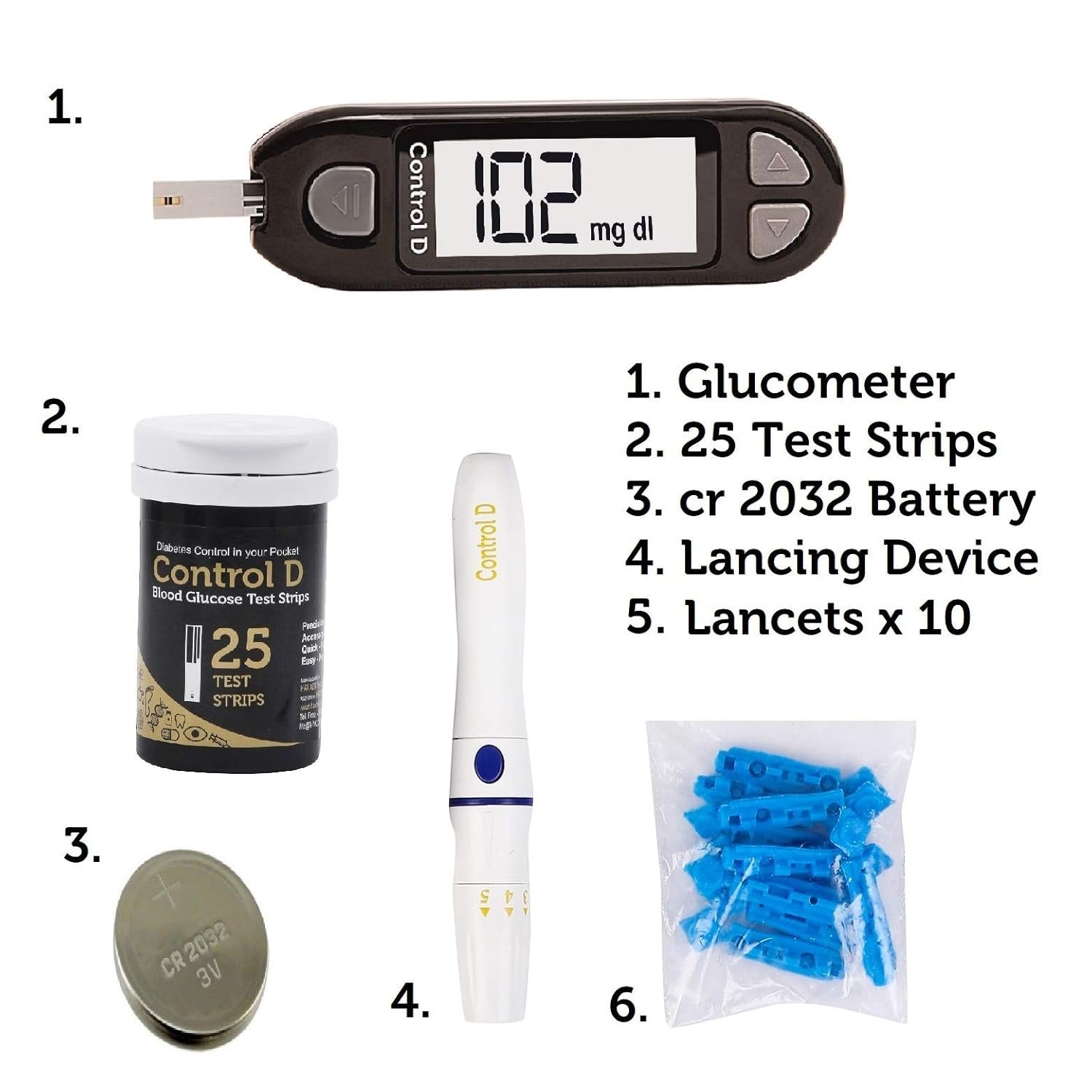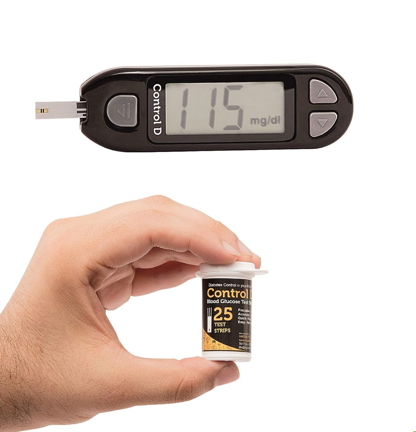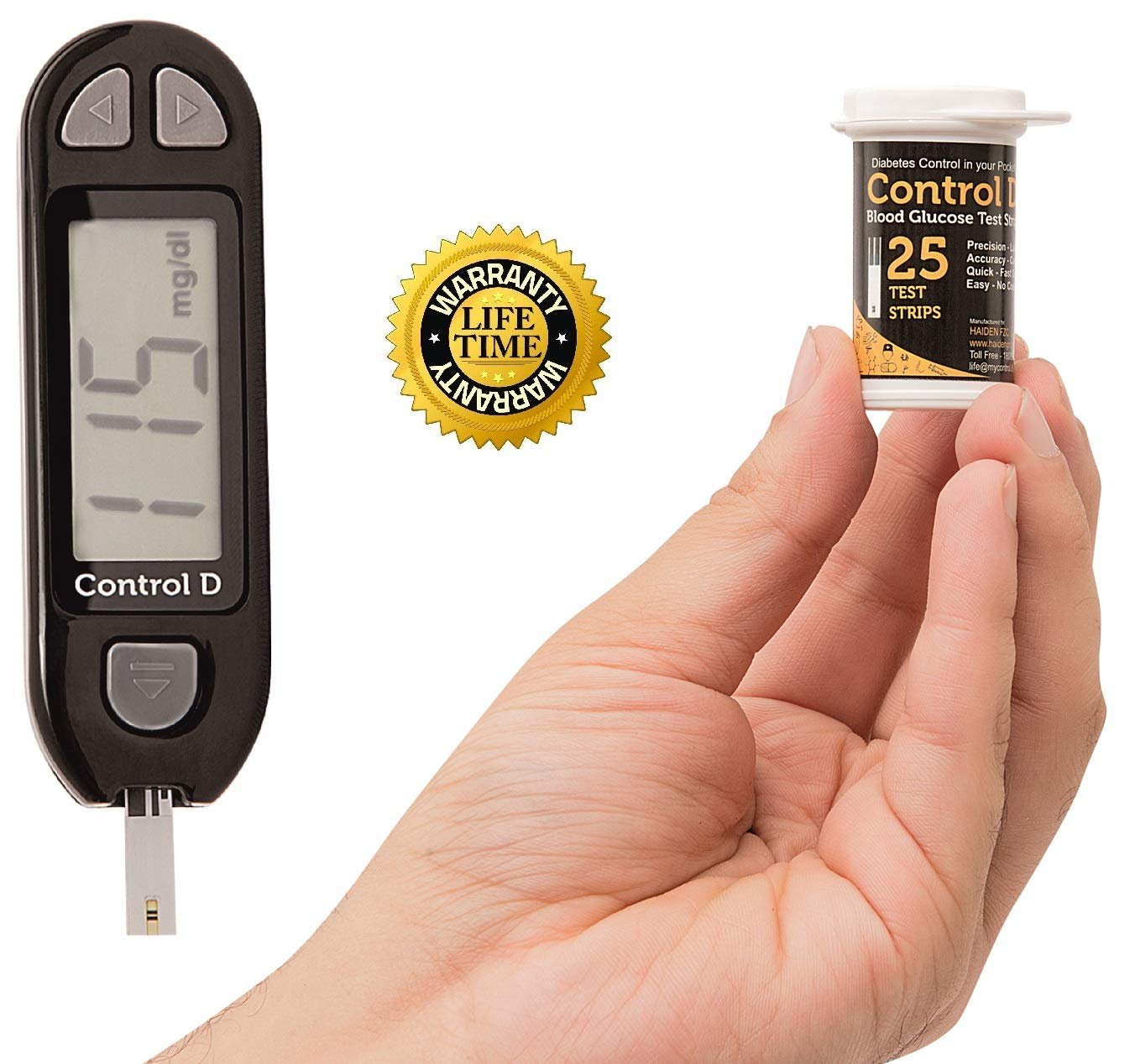 Control D is a Diabetes Management kit packed in a crafted plastic box that fits inside the pocket of the patient. Control D uses advanced Amperometric Biosensors to measure accurate blood glucose using a low volume of blood in 5 seconds. This kit has 25 strips bundled with a full meter kit for easy testing at home.